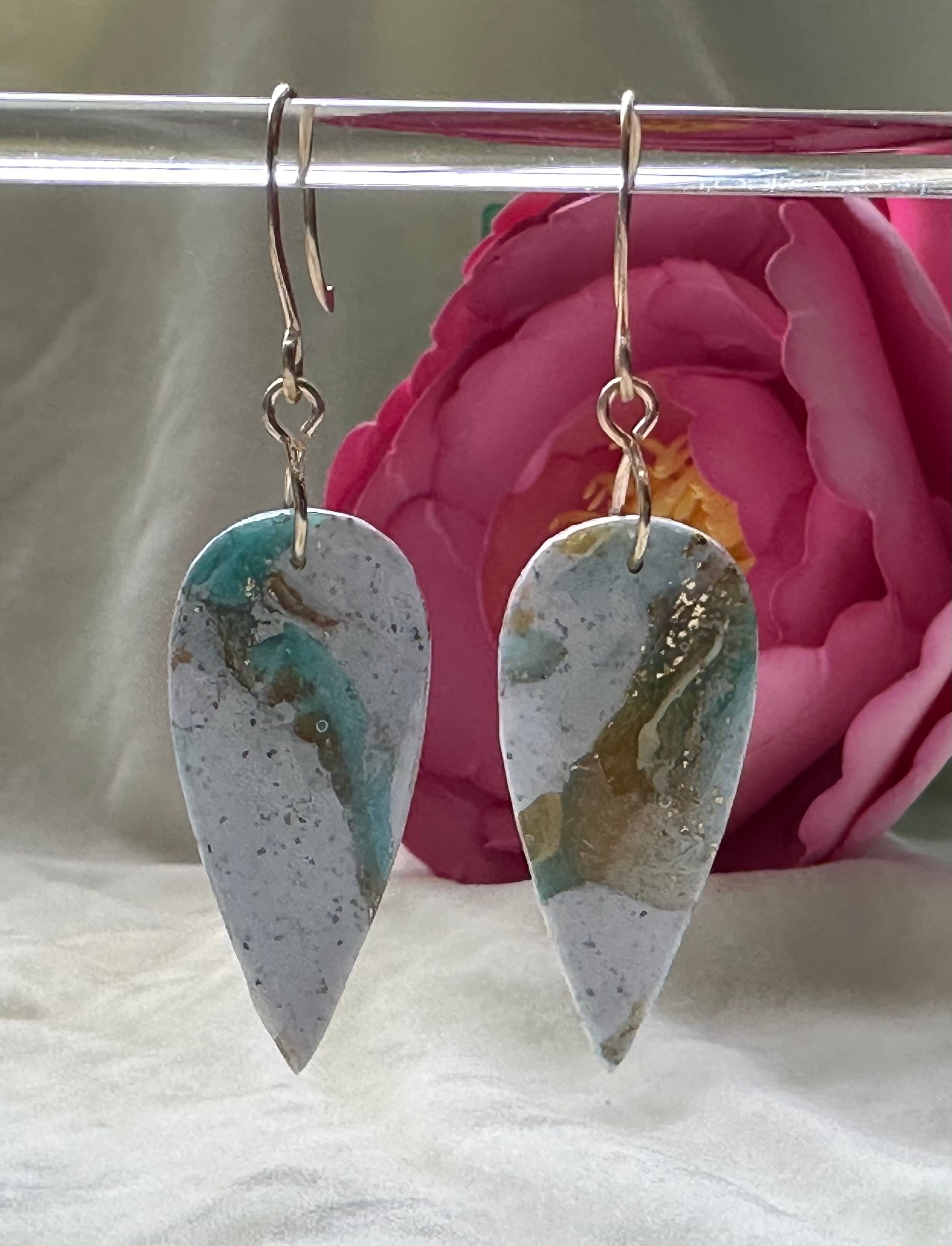 “Stones” are all handcrafted from polymer clay, acrylic and metal foils. Shiny finish is created with UV resin. Matte finish items are the natural clay finish. Most of the findings are handmade and hand hammered using a variety of wires including Gold Filled and Argentium Silver. Type of wire is noted in case you have any metal allergies.
