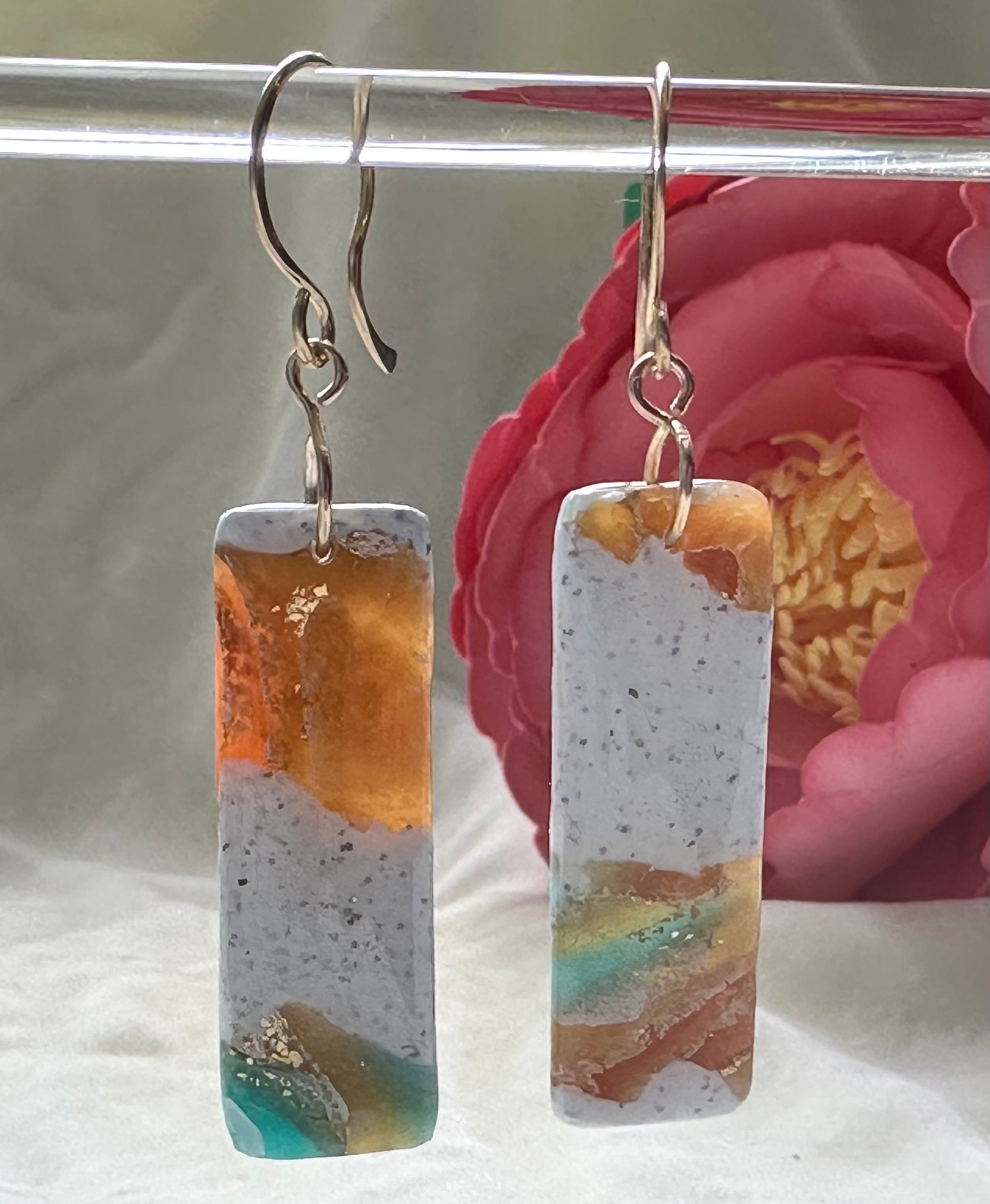 “Stones” are all handcrafted from polymer clay, acrylic and metal foils. Shiny finish is created with UV resin. Matte finish items are the natural clay finish. Most of the findings are handmade and hand hammered using a variety of wires including Gold Filled and Argentium Silver. Type of wire is noted in case you have any metal allergies.