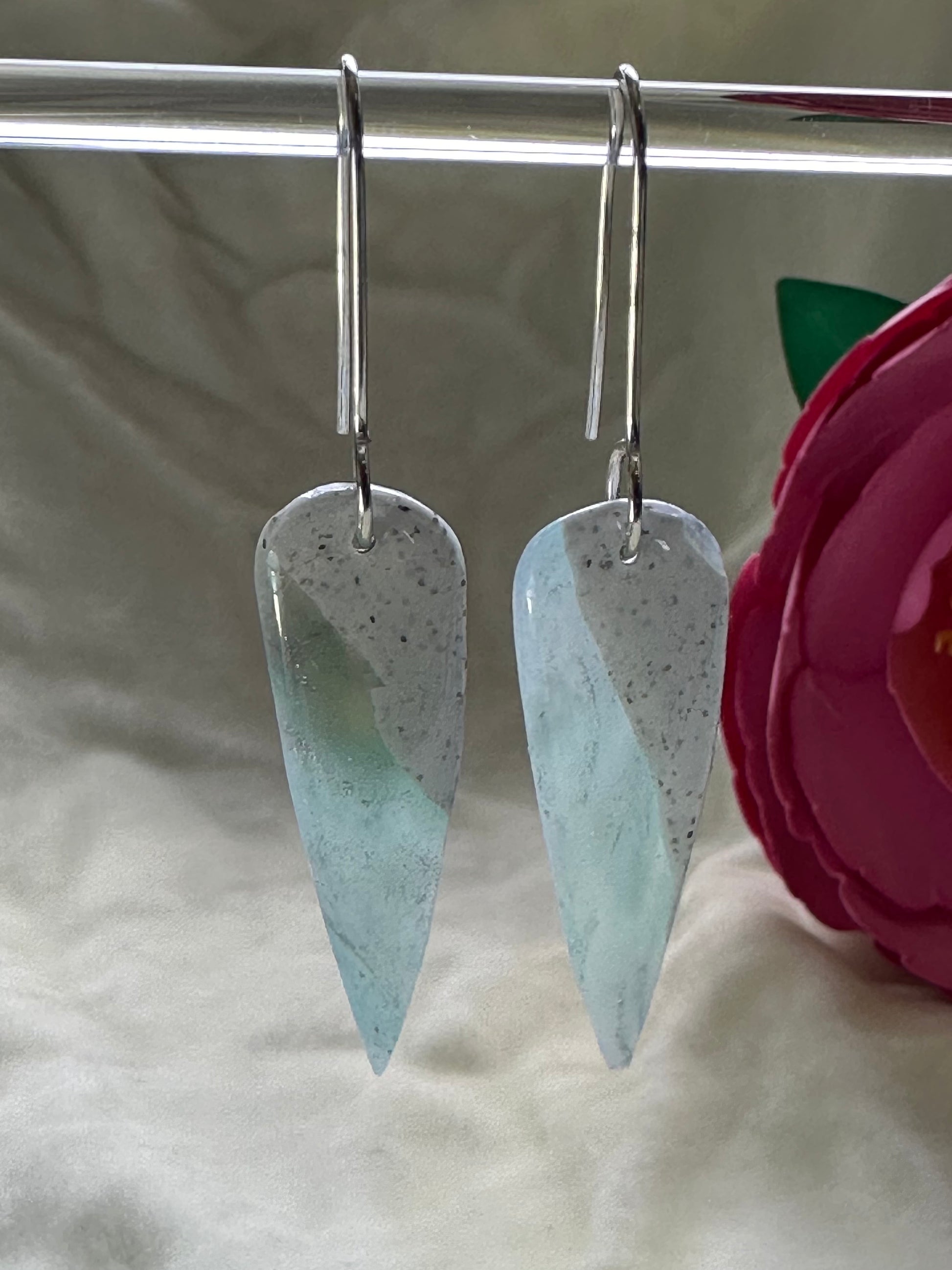 Blues and silver with white stone accents. Hand made Argentium Silver long hooks.