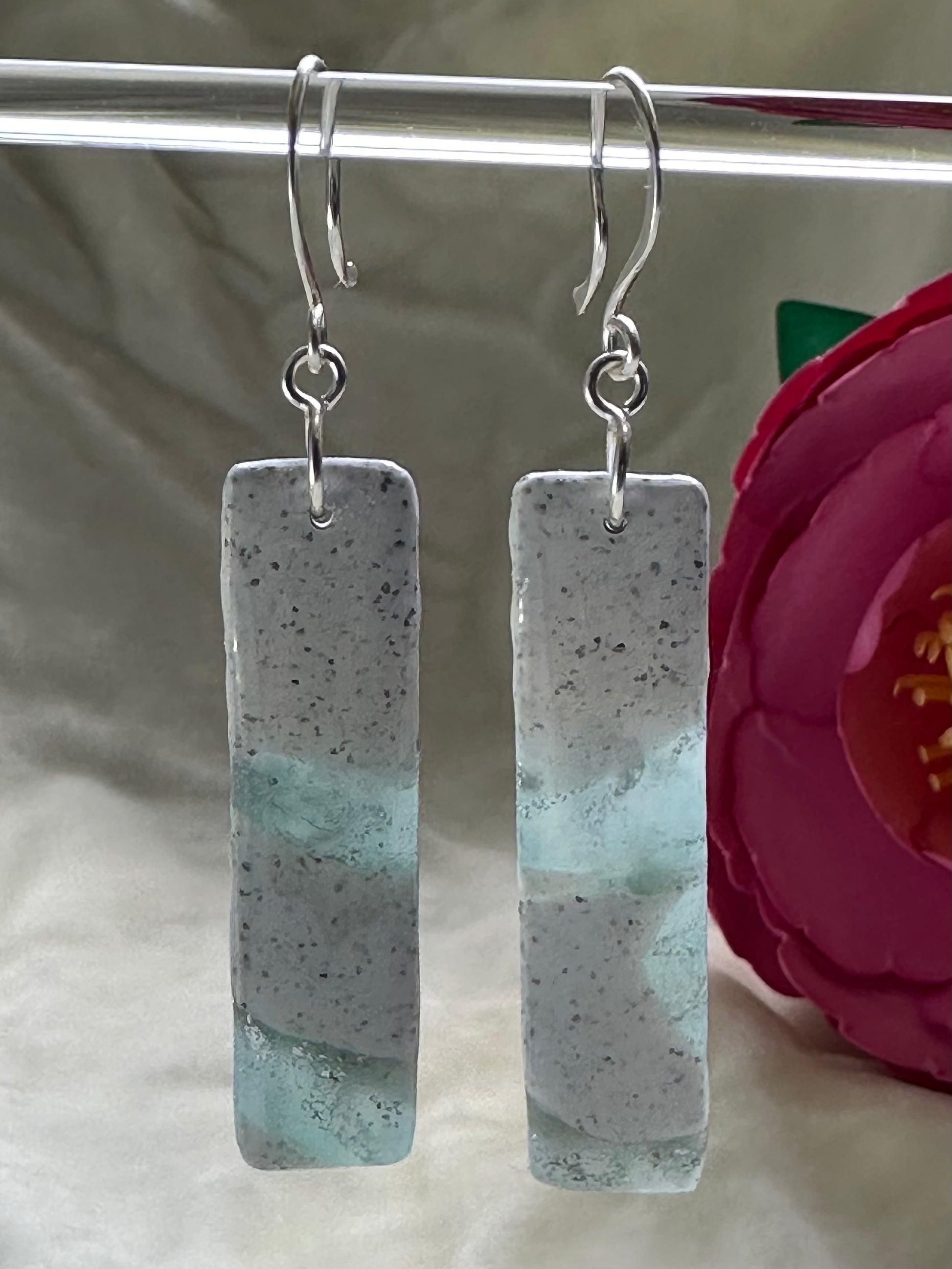 Blue and silver with white stone accents. Hand hammered silver plated copper hooks.
