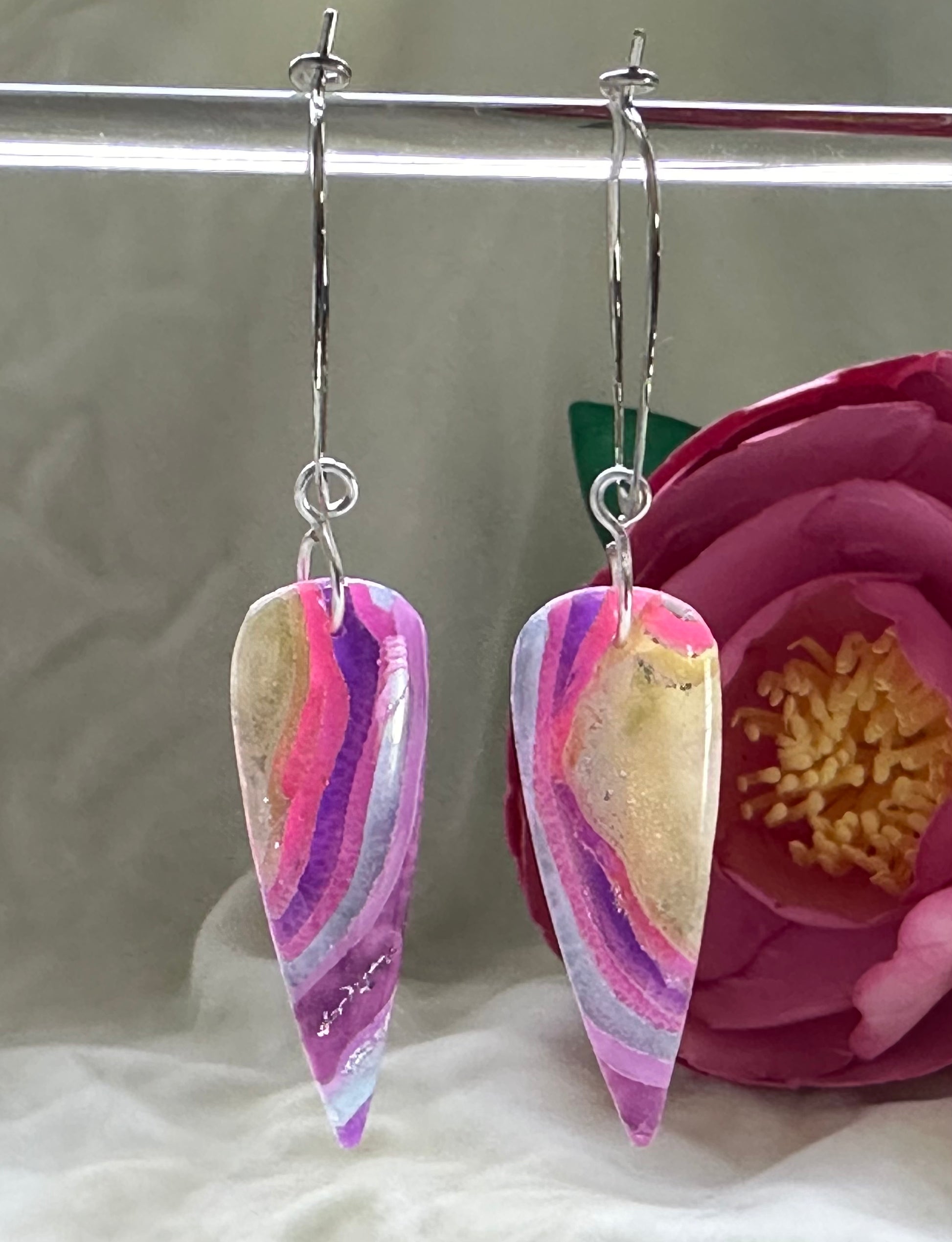 “Stones” are all handcrafted from polymer clay, acrylic and metal foils. Shiny finish is created with UV resin. Matte finish items are the natural clay finish. Most of the findings are handmade and hand hammered using a variety of wires including Gold Filled and Argentium Silver. Type of wire is noted in case you have any metal allergies.