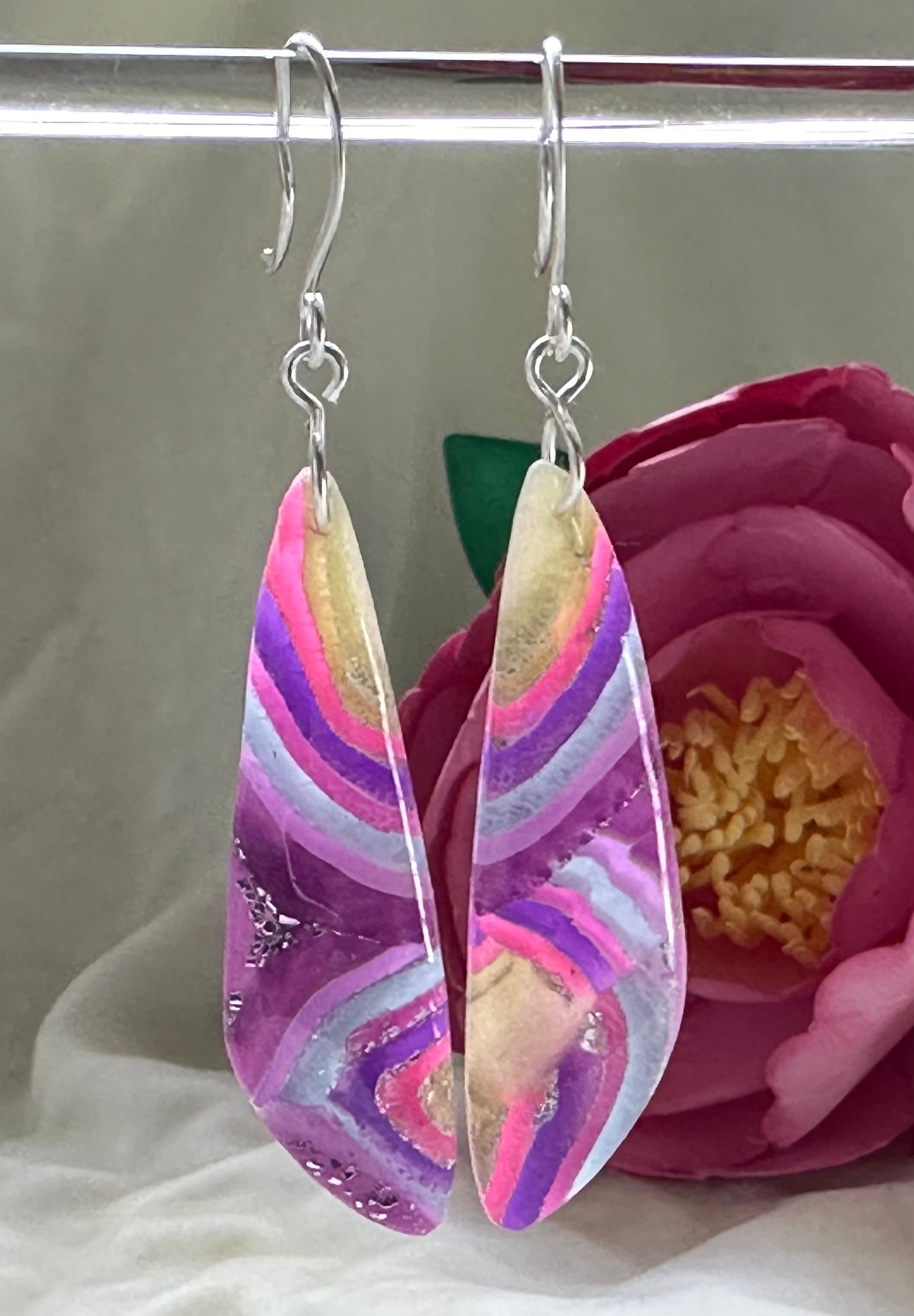 “Stones” are all handcrafted from polymer clay, acrylic and metal foils. Shiny finish is created with UV resin. Matte finish items are the natural clay finish. Most of the findings are handmade and hand hammered using a variety of wires including Gold Filled and Argentium Silver. Type of wire is noted in case you have any metal allergies.