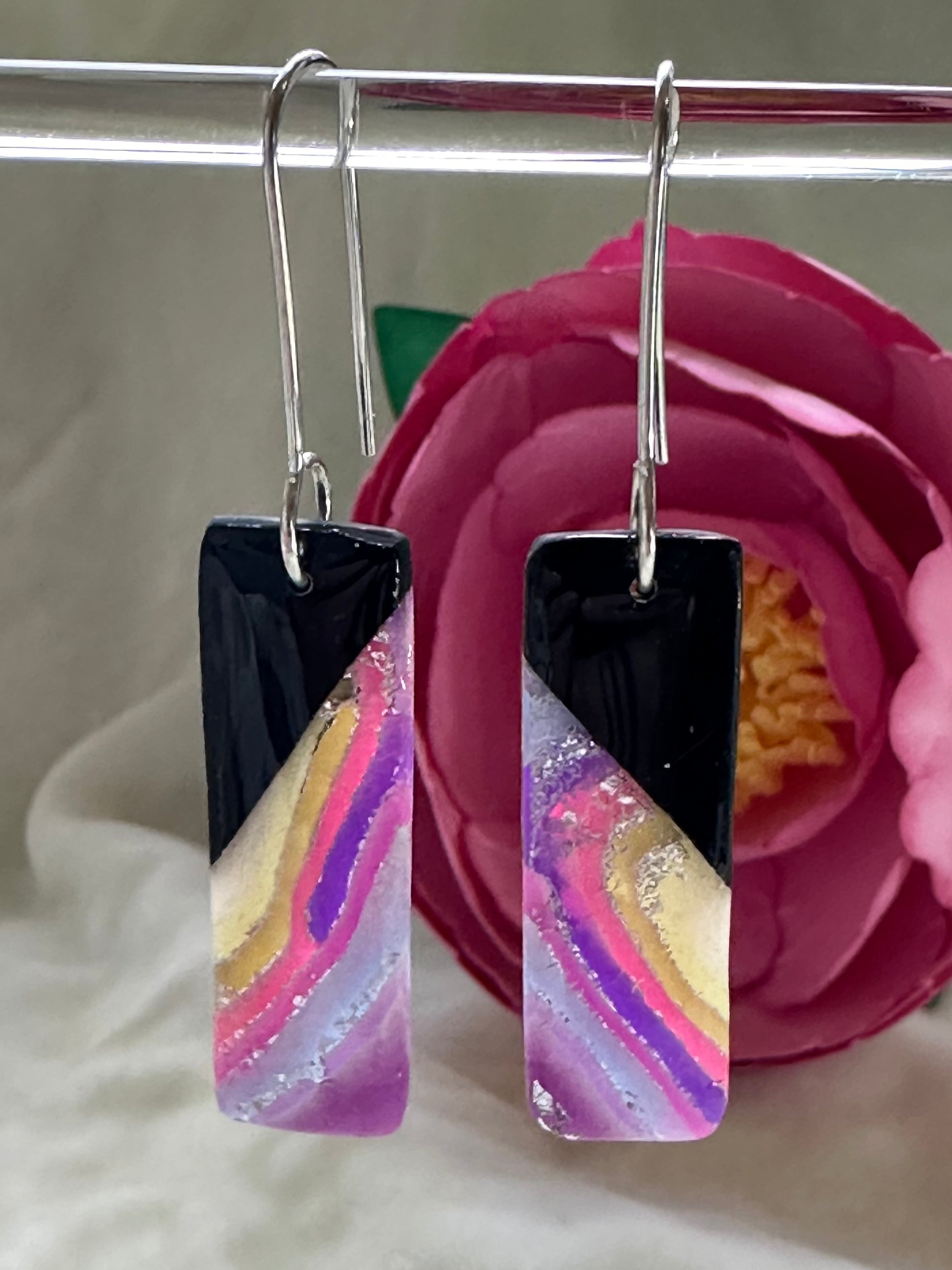 Summer Agate with black and silver accents and handmade Argentium Silver long hooks.